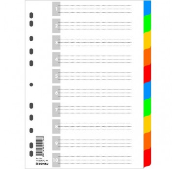 Kolorowe przekładki Donau A4 z polipropylenu 120μm, 11 otworów, 10+1 kart. Ekologiczne, trwałe i estetyczne – idealne do biura, szkoły i domu.