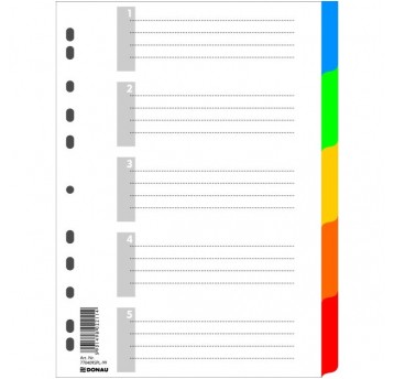 Przekładki A4 Donau PP kolorowe 5+1 karta opisowa. Wykonane z ekologicznego polipropylenu 120 μm, trwałe i estetyczne. Idealne do segregacji dokumentów.