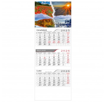 Kalendarz trójdzielny Crux z pejzażem zachodu nad Bałtykiem, z kalendarium T11 i paskiem wskazującym bieżący dzień. Łatwy w odczycie i estetyczny, idealny do biura, gabinetu i jako kalendarz firmowy.