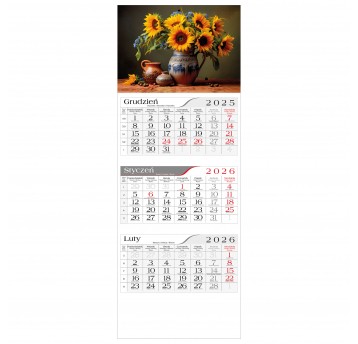 Kalendarz trójdzielny Crux Słoneczniki to czytelny i estetyczny kalendarz ścienny z kalendarium T11, numeracją tygodni i miejscem na nadruk. Idealny do biura i domu, ułatwia planowanie przez cały rok.