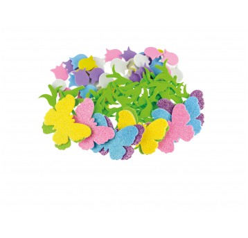 Naklejki z pianki Brewis PVC29, zestaw 92 sztuk w kształcie kwiatów i brokatowych motyli. Kolorowe i samoprzylepne, doskonałe do dekoracji, prac plastycznych oraz kreatywnej zabawy.