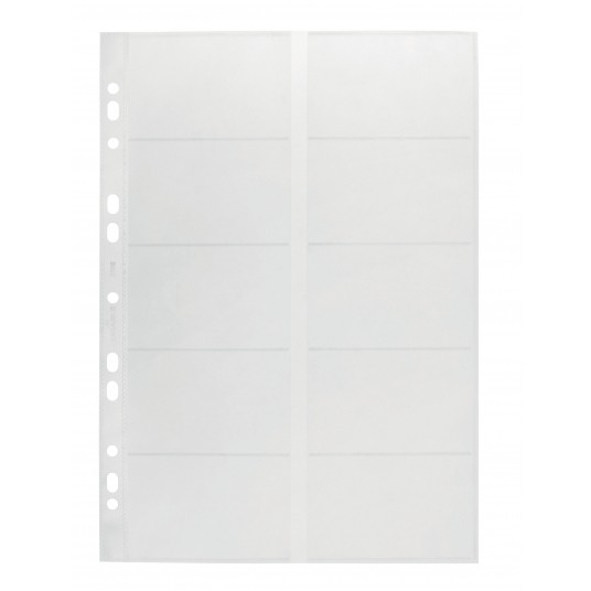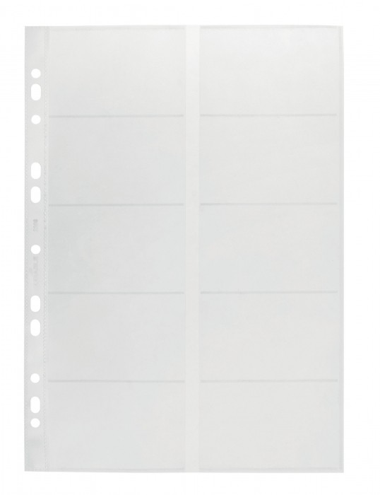 10 przezroczystych kieszonek z PP na 200 wizytówek o wymiarach 57 x 90 mm.