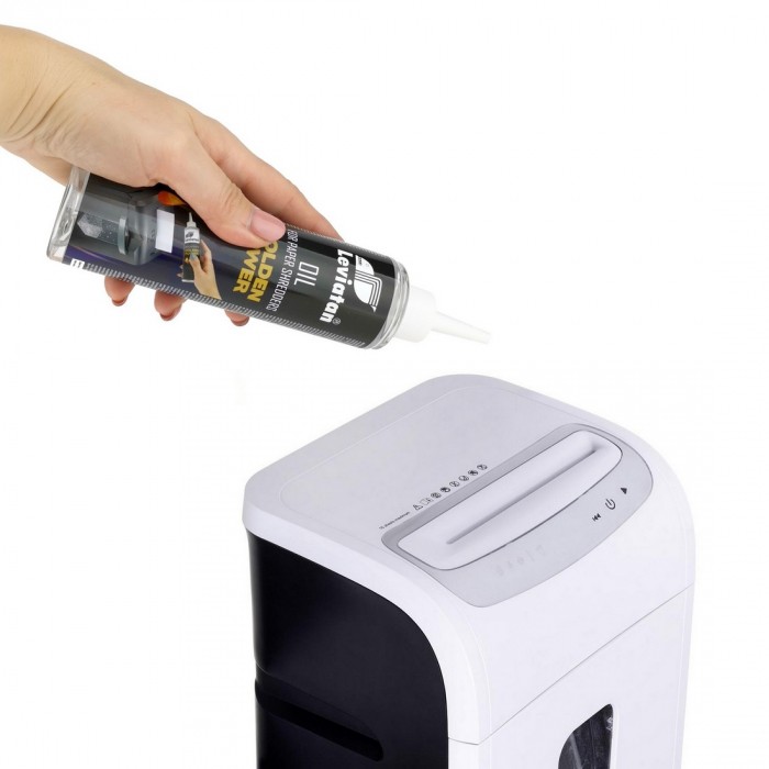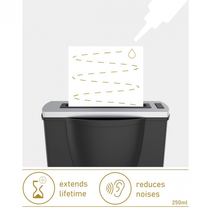 Sposób użycia : niewielką ilość oleju należy nanieść bezpośrednio na noże tnące lub na kartkę papieru i pociąć ją w niszczarce.