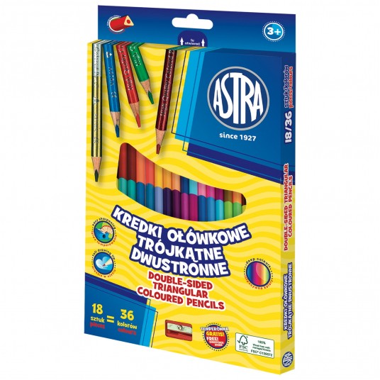 Kredki ołówkowe trójkątne dwustronne ASTRA 18=36 kolorów z temperówką