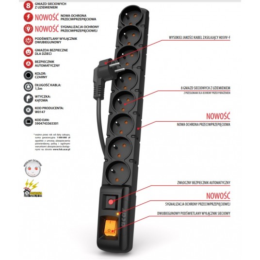 | Ilość gniazd sieciowych | 8 gniazd dwubiegunowych ze stykiem ochronnym 10A/250V |
