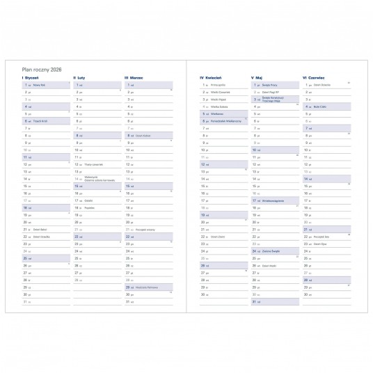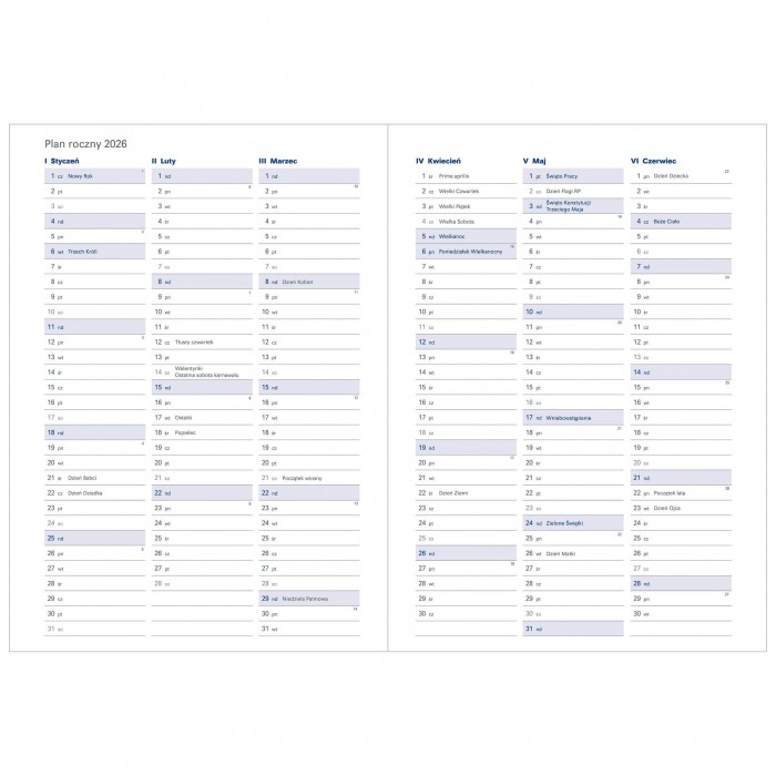 Terminarz w układzie dziennym, drukowany na papierze białym. SOBOTA i NIEDZIELA na osobnych stronach.