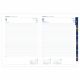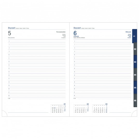 Blok terminarza szyty nićmi, z kapitałką i tasiemką w kolorze szarym oraz perforowanymi narożnikami i wyciętymi registrami.