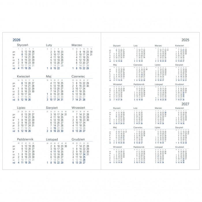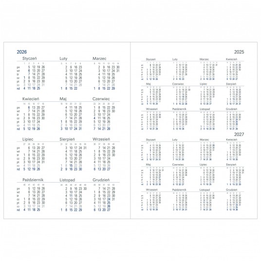 Terminarz książkowy zawiera m.in.: plan roku kalendarium 2024, 2025 i 2026 plan urlopowy kalendarz wieczny dni wolne w UE+UK informacje dla kierowców wspólne oświadczenie o zdarzeniu drogowym zasady pierwszej pomocy przedmedycznej zasady selektywnej zbiórki odpadów układ SI alfabetyczny skorowidz teleadresowy barwne mapy (PL, UE, świat, kalendarz pyleń, strefy czasowe)