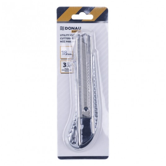 Metalowy nóż pakowy DONAU SAFETY srebrny z hartowanym ostrzem 18 mm i aluminiową obudową to trwałe i precyzyjne narzędzie do cięcia kartonu, papieru i folii. Z blokadą ostrza i wygodnym suwakiem.