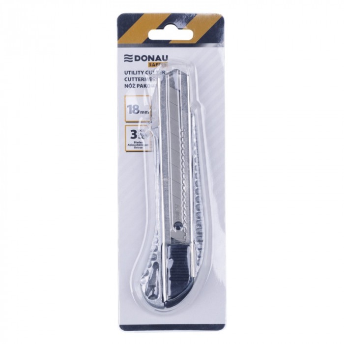 DONAU SAFETY w wersji metalowego noża pakowego to niezawodne i solidne narzędzie przeznaczone do cięcia kartonów, papieru oraz różnego rodzaju materiałów pakowych. Dzięki 7-częściowemu ostrzu z możliwością odłamywania zużytych segmentów użytkownik zawsze dysponuje ostrą i gotową do działania krawędzią. Hartowane ostrze stalowe, szerokości 18 mm i długości 100 mm, gwarantuje trwałość i skuteczność nawet przy intensywnej eksploatacji.