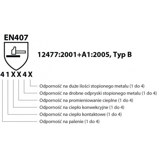 Model wyposażono w długi, sztywny mankiet wykonany ze skóry bydlęcej dwoinowej, który chroni przedramię przed iskrami i odpryskami. Rękawice są szyte trwałą nicią bawełnianą i zaprojektowane z myślą o komforcie, odporności i bezpieczeństwie. Spełniają szereg norm europejskich, w tym EN 388:2016+A1:2018 (3121X), EN 407:2004 (41XX4X), EN ISO 21420:2020 oraz EN 12477:2001+A1:2005, Typ B, co klasyfikuje je jako środek ochrony indywidualnej kategorii II ⚠️.