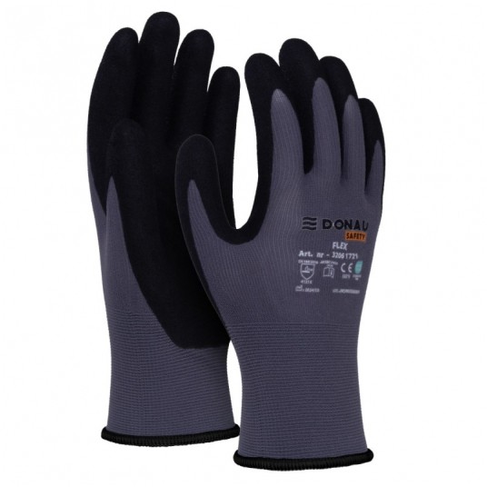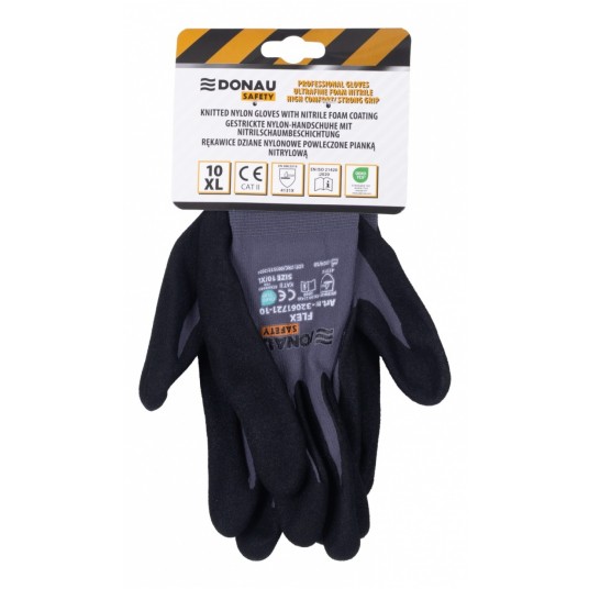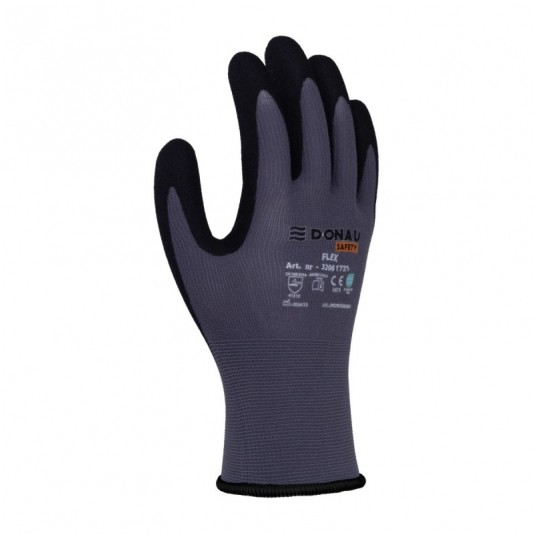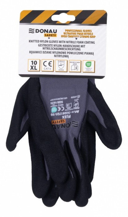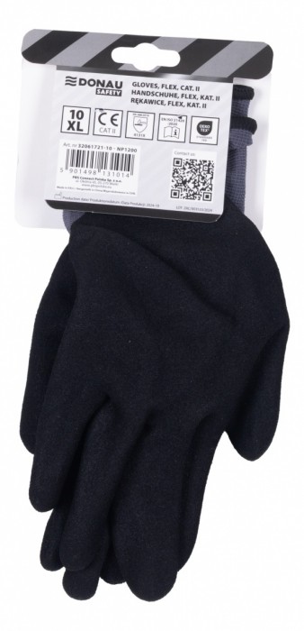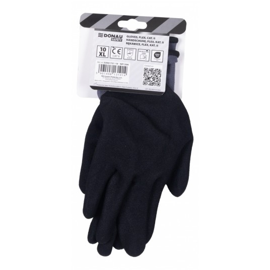 Wytrzymałe rękawice ochronne DONAU SAFETY Flex kat. II, rozmiar 10 – idealne do precyzyjnych prac montażowych, serwisowych i ogrodowych. Doskonała przyczepność, komfort i oddychalność.