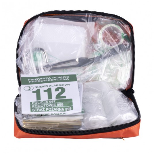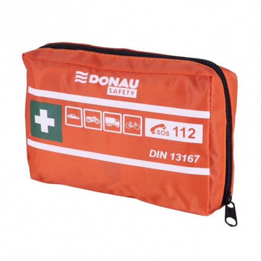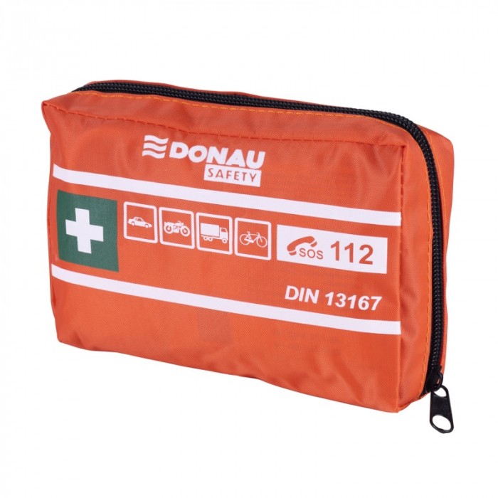 Poręczna apteczka samochodowa DONAU SAFETY DIN MINI w wodoodpornej saszetce z rzepem. Zgodna z normą DIN 13167, idealna do aut osobowych i ciężarowych. Kompaktowa, lekka i gotowa do użycia.
