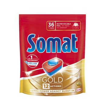 Tabletki do mycia naczyń Somat Gold usuwają nawet najcięższe przypalenia i pozostałości posiłku, sprawiając, że naczynia są za każdym razem idealnie czyste i lśniące.