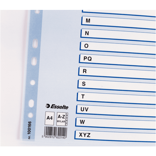 20 kolorowych indeksów zadrukowanych alfabetycznie A-Z, pomocnych w szybkim dostępie do dokumentów