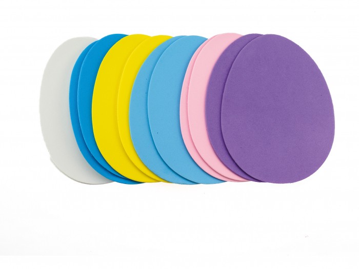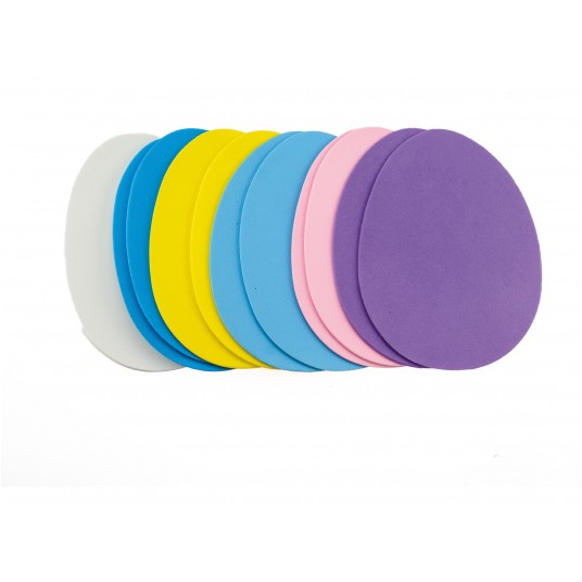 Zestaw dużych jajek z pianki PVC w sześciu kolorach: biały, żółty, różowy, fioletowy, jasny niebieski, niebieski.