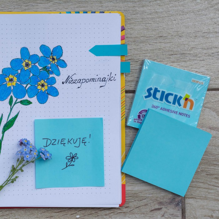 klej umieszczony na każdej krawędzi, co pozwala na dowolne przyklejenie karteczki,
