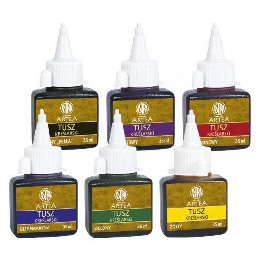 Tusz kreślarski ASTRA przeznaczony do kreślenia grafionem na kalce technicznej i rysowania piórkiem na kartonie lub papierze