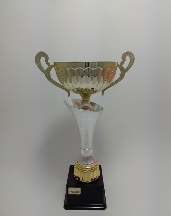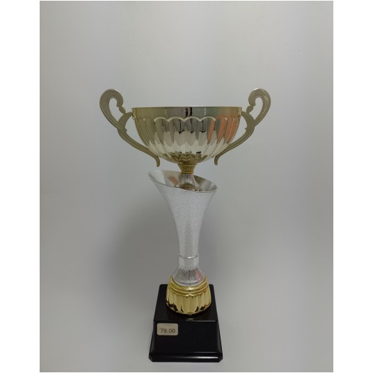 Metalowy, złoty puchar, ze srebrym elementem. Wysokość ok. 40 cm. Podstawa z tworzywa sztucznego 10x10x5 cm.
