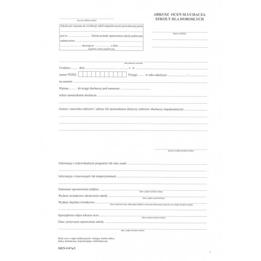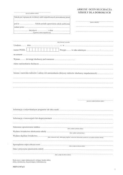 Arkusz ocen dla słuchaczy szkoły dla dorosłych, z wyjątkiem słuchaczy szkoły policealnej dla dorosłych