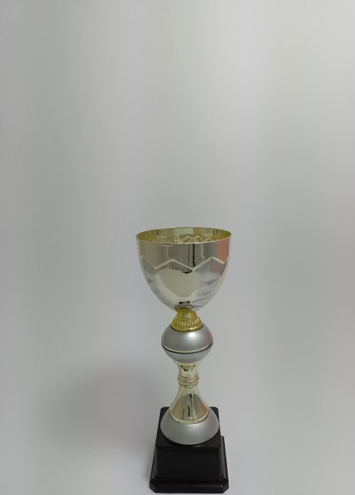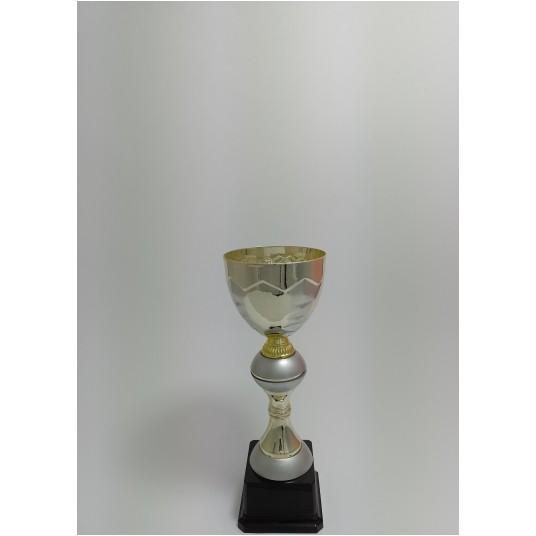 Metalowy, złoty puchar ze srebrnymi elementami. Wysokość ok. 21 cm. Podstawa z tworzywa 6x6x3 cm.
