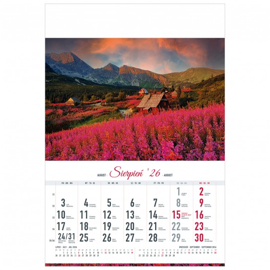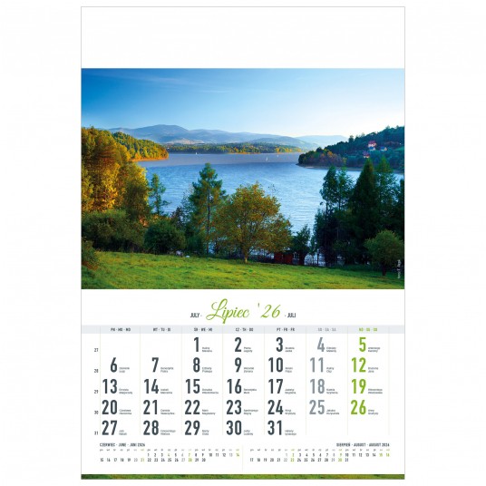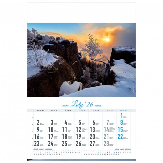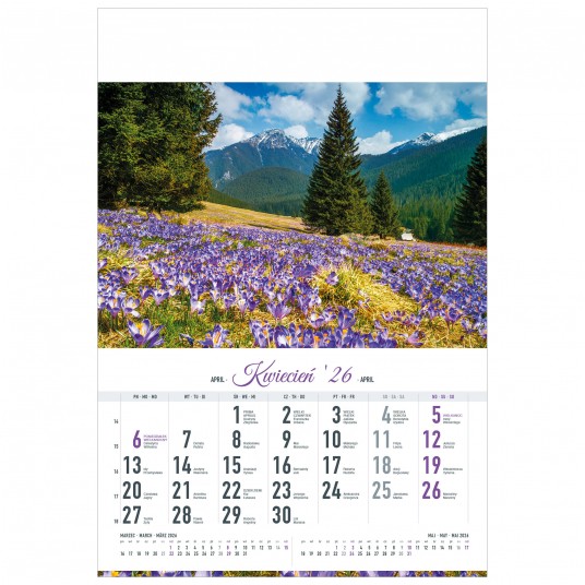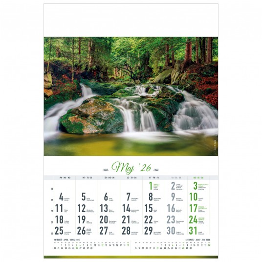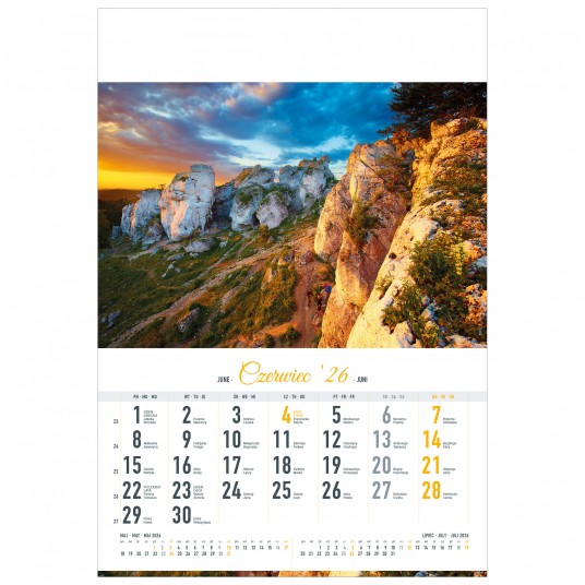 Kalendarz wiszący ścienny ze spiralą i uchwytem. Podzielony na dwanaście miesięcy, na każdej stronie inna grafika i kalendarium.