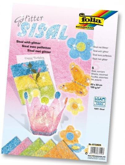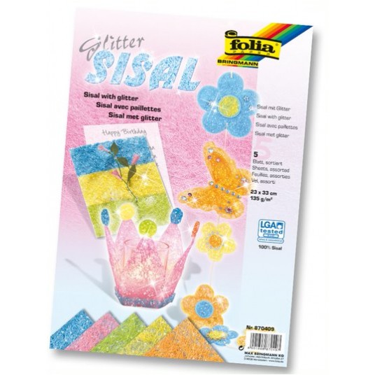 Sizal to naturalne włókno otrzymywane z agawy sizalowej. Znakomite do tworzenia ozdób oraz dekoracji, kartek okolicznościowych, etc. Zestaw zawiera 5 arkuszy o wymiarach 23c33cm w 5 kolorach. Arkusze w pastelowych kolorach, ozdobione brokatem.