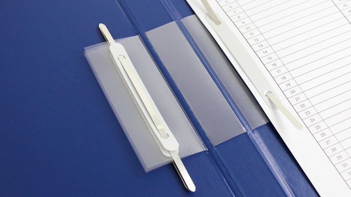 Wewnątrz zamontowano mechanizmy skoroszytowe umożliwiające wpięcie dokumentów