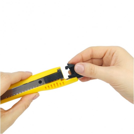 Nóż posiada bardzo praktyczny wbudowany plastikowy element, który ułatwia odłamywanie stępionych końcówek