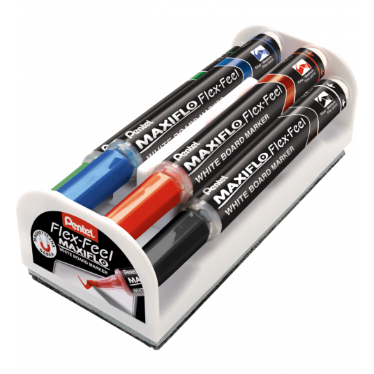Zestaw markerów Flex-Feel do białych i ceramicznych tablic z elastyczną końcówką w kształcie pędzelka. Produkt łączy w sobie cechy dwóch i umożliwia pisanie w bardzo szerokim zakresie grubości, od 1 do 5 mm. Wyraźne kolory aż do ostatniej kropli tuszu. Nie zawierają ksylenu i toluenu. Dłuższa linia pisania niż w standardowych markerach z sączkiem. Zestaw wyposażony w gąbkę magnetyczną.