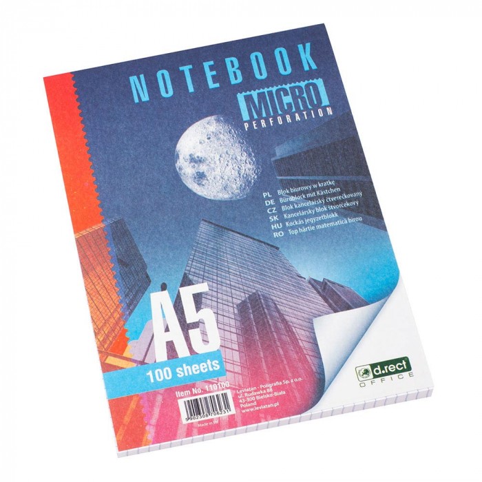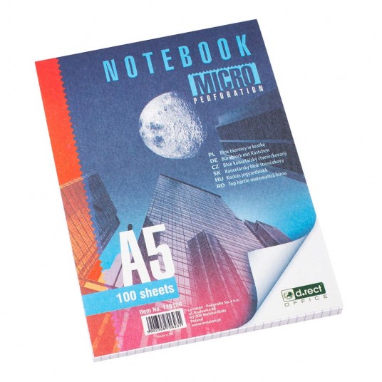 Blok biurowy o bardzo dobrej jakości do codziennego użytku w domu, pracy i w szkole. Idealny do robienia notatek, szkicowania etc. Wygodę użytkowania zapewnia mikroperforacja ułątwiająca wyrywanie kartek, oraz możliwość wpięcia do teczki, dzięki grzbietowi sklejonemu u góry. Liniatura w kratkę. Format A5 Liczba kartek: 100