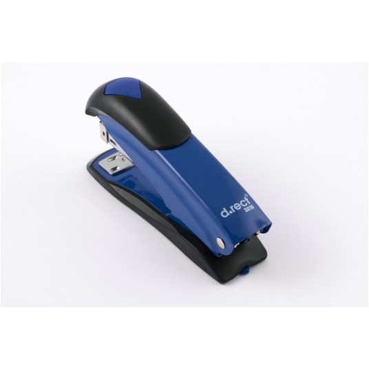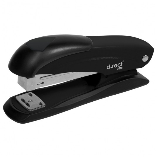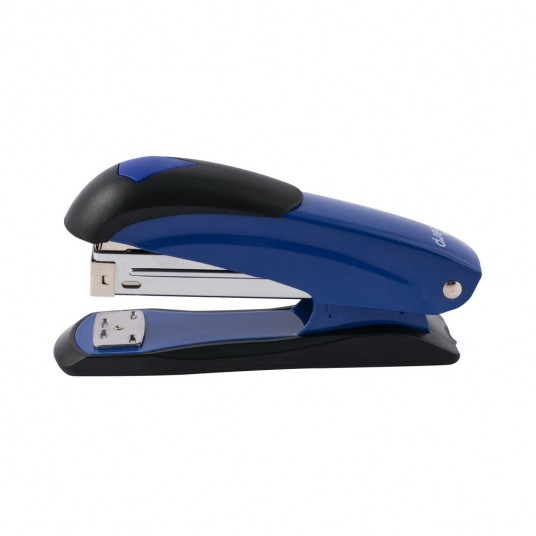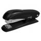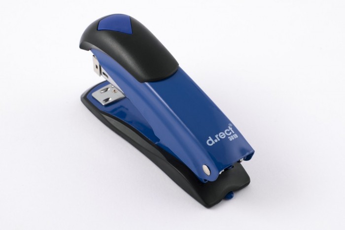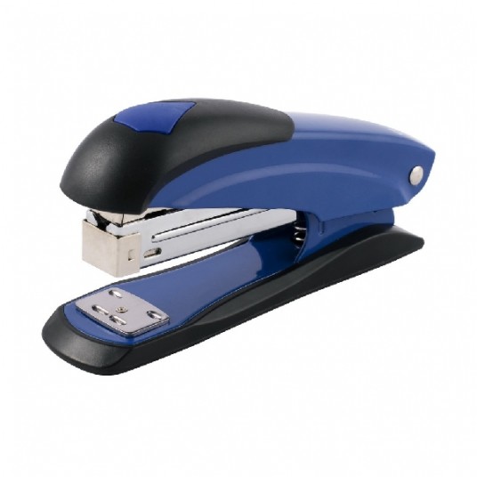 Solidny metalowy zszywacz biurowy z plastikowymi antypoślizgowymi nakładkami na ramieniu i na podstawie.