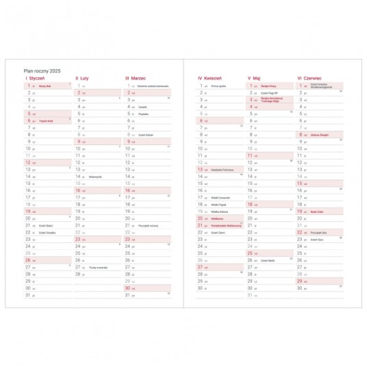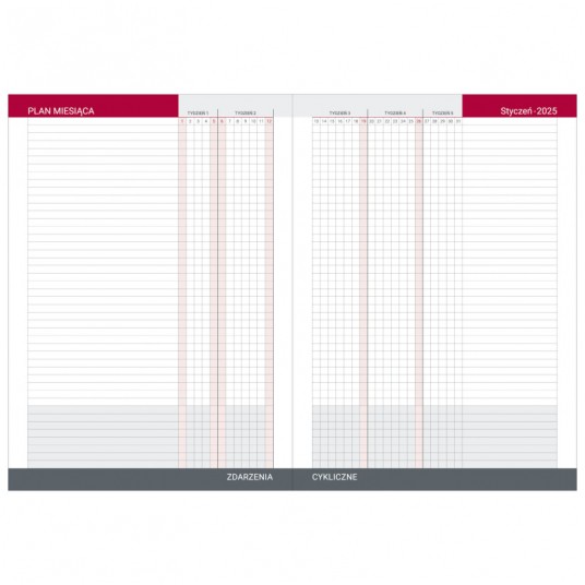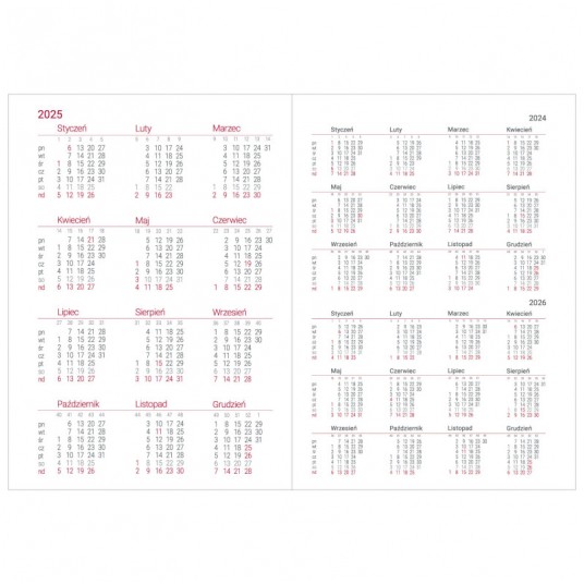 Terminarz książkowy zawiera plan miesiąca przed każdym rozpoczynającym się miesiącem oraz m.in.: plan roku kalendarium 2023, 2024 i 2025 plan urlopowy wieczny kalendarz dni wolne w UE + UK informacje dla kierowców wspólne oświadczenie o zdarzeniu drogowym zasady selektywnej zbiórki odpadów jednostki w układzie SI wschody i zachody Słońca, fazy Księżyca alfabetyczny skorowidz teleadresowy barwne mapy