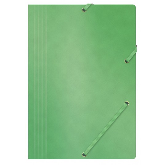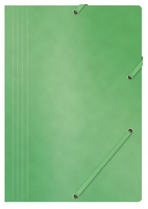 Zamykana za pomocą 2 płaskich, narożnych gumek w kolorze teczki