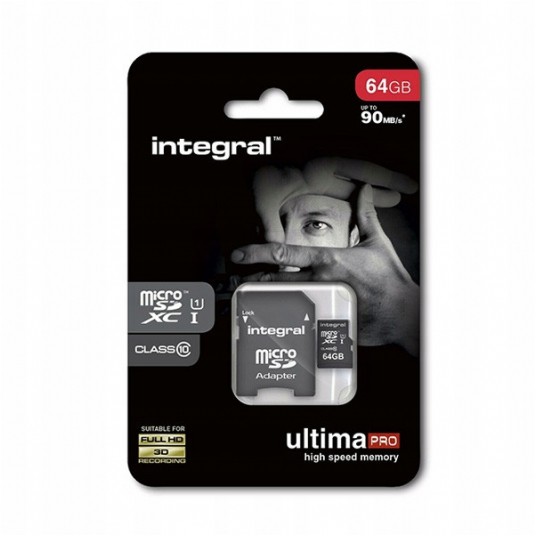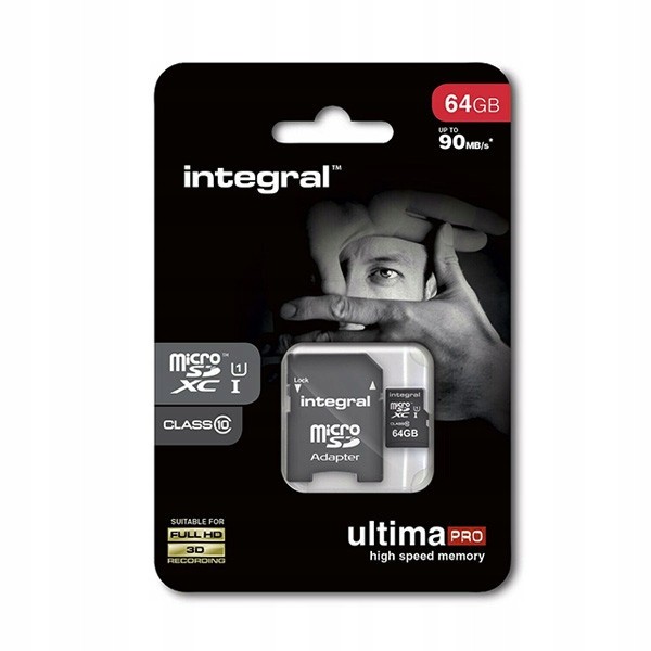Karta pamięci microSDXC marki Integral o pojemności 64 GB. Klasa 10