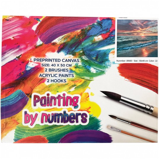 Zestaw do malowania po numerach zawiera: - wysokiej jakości płótno rozciągnięte na drewnianej ramie - rozmiar: 50x40 mm - farby przyjazne dla środowiska - trzy pędzelki wykonane z wysokiej jakości materiałów