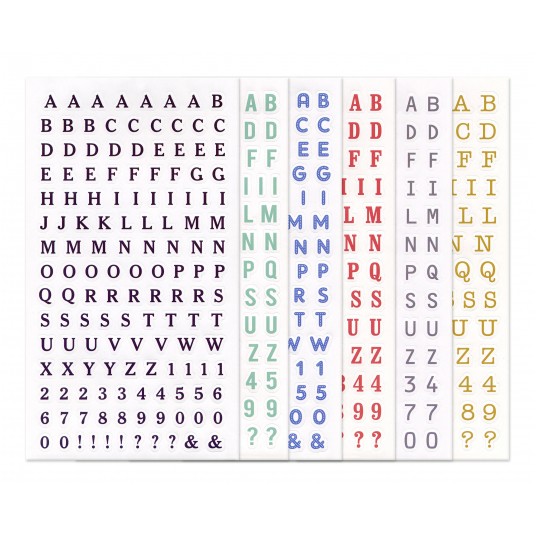 6 arkuszy z zestawem liter i cyfr w różnych kolorach