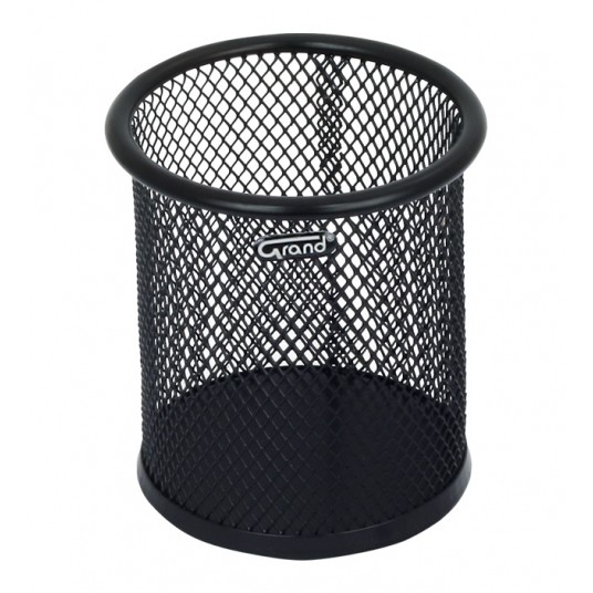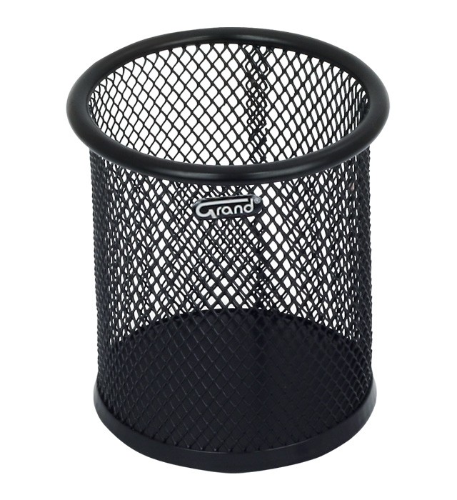 Wykonany z lakierowanego na czarno metalu ażurowy pojemnik na długopisy