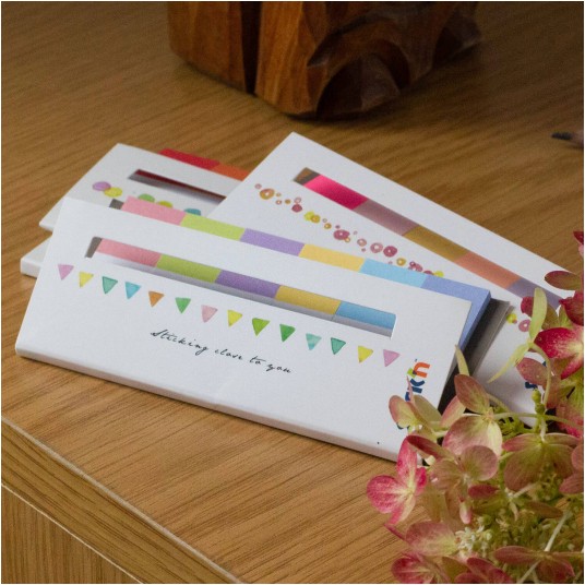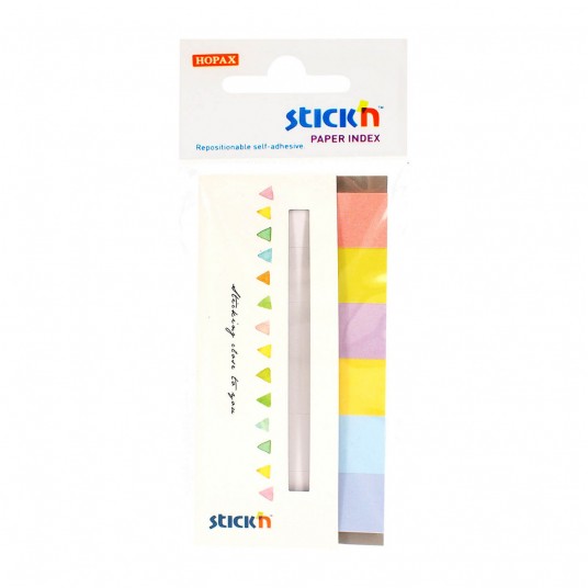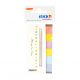 Zestaw w papierowym etui zawiera 6 bloczków 45 × 15 mm po 30 karteczek każdy, w sumie 180 zakładek w 6 różnych kolorach.