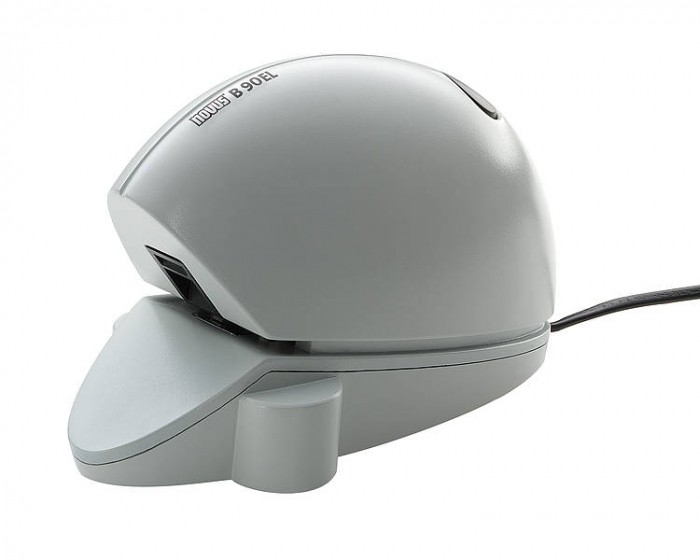 Zszywacz elektryczny o nowoczesnym kształcie myszy, wyposażony w plastikowy magazynek na dwa rodzaje zszywek.